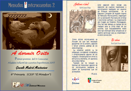 Este pequeño libro recoge una selección de cuentos hiperbreves o microcuentos realizados por alumnos de Primaria participantes en el Primer Certamen de Aladdin infantil de Menudos Microcuentos, organizado por el Colegio de Fomento Monteagudo con la colaboración de la Asociación Murciana de Artistas y Escritores (AMAE).